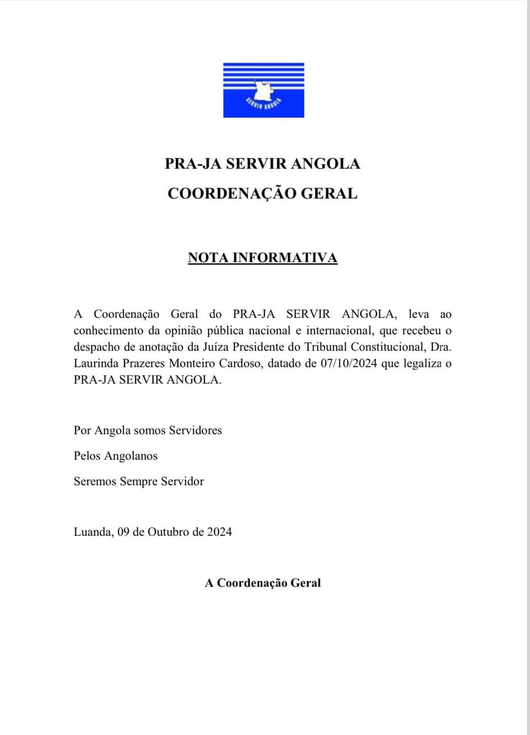 A informação foi divulgada nas redes sociais , pela Coordenação Geral da nova força política angolana.
